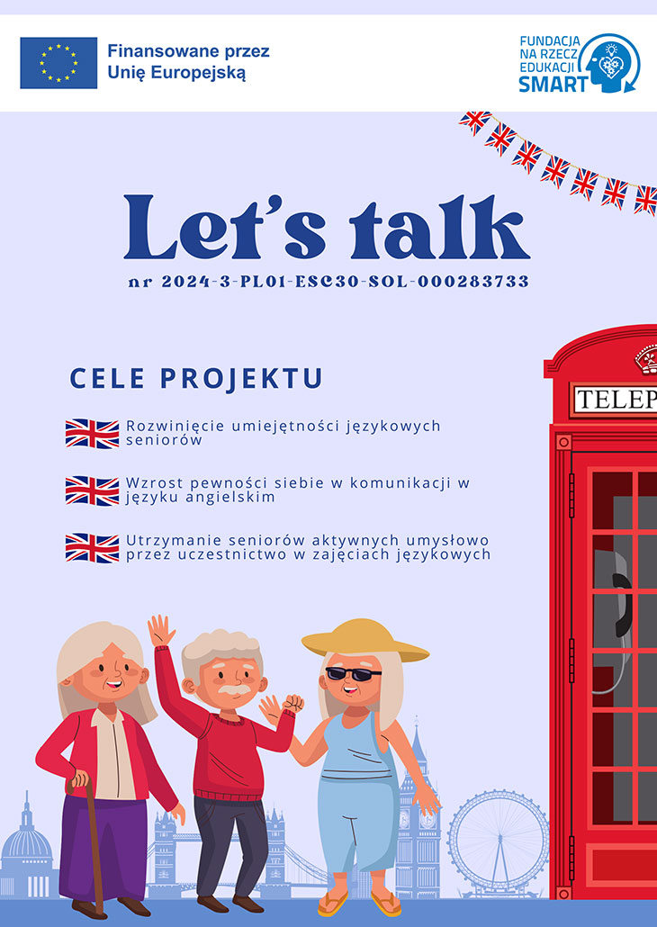 „Let’s Talk!” to wyjątkowa inicjatywa skierowana do seniorów 60+, której głównym celem jest poprawa jakości życia poprzez naukę praktycznego języka angielskiego. Projekt został stworzony z myślą o tych, którzy pragną rozwijać swoje umiejętności komunikacyjne, poznawać nowe kultury i zyskiwać pewność siebie w kontaktach z obcojęzycznymi osobami – zarówno w codziennych sytuacjach, jak i podczas podróży zagranicznych.